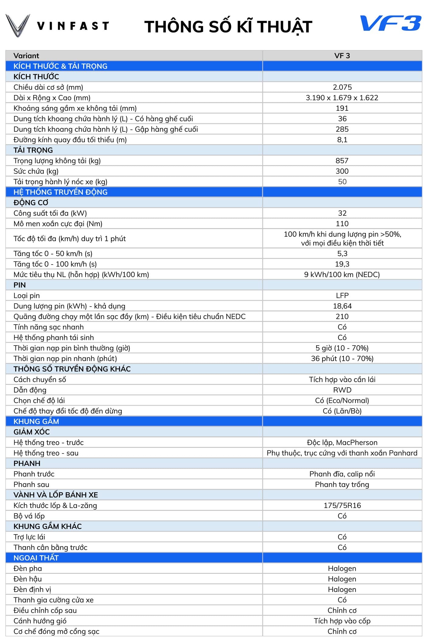 Bảng thông sô kỹ thuật xe ô tô VinFast VF 3.