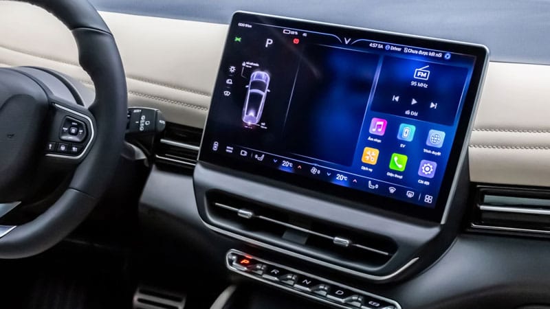 Với kích cỡ 12,9 inch, có thể tùy chỉnh cá nhân hóa theo người dùng. Màn hình giải trí cảm ứng của VF 7 có thể giúp điều khiển các chức năng trên xe bằng cách vuốt/chạm nhẹ hoặc ra lệnh cho trợ lý ảo qua giọng nói.